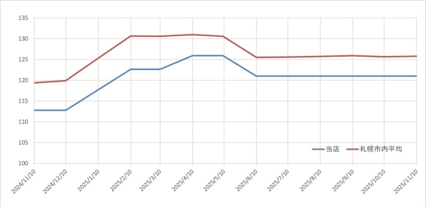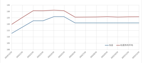 以下グラフは、札幌市内平均と当店の配達価格の推移となっています。